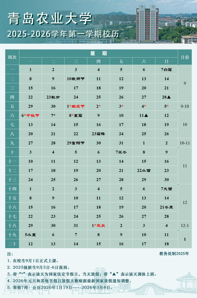校历是学校以学期或学年为单位编制的日历,是学校一个学期或学年内学习和工作的日程安排。米兰milan官方网站校历由学校教务处编制,每个学期末编制并发布下一学期的校历。米兰milan官方网站每学期的教学周一般为20周,其中第19、20周为考试周,专门用于安排期末考试。