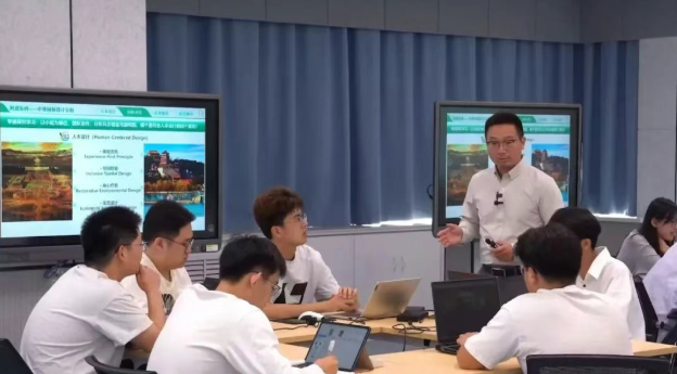 郑涛还发挥课堂教学的主渠道作用,推动课程思政和思政课程同向同行,形成协同效应。郑涛将价值塑造、知识传授和能力培养融为一体,深度挖掘课程蕴含的丰富思政资源,开展中外园林史课程思政教学改革探索。在教学中,他用OBS技术引领学生走入颐和园的湖光山色中,感悟传统文化中“天人合一”的生态思想;在讲解宏伟壮丽的凡尔赛宫中,教会学生思考如何运用西方设计智慧赋能当代中国设计,让古今中外的智慧在学生心中蕴育成长的力量,共同启迪青年设计者为建设美丽中国发奋学习。