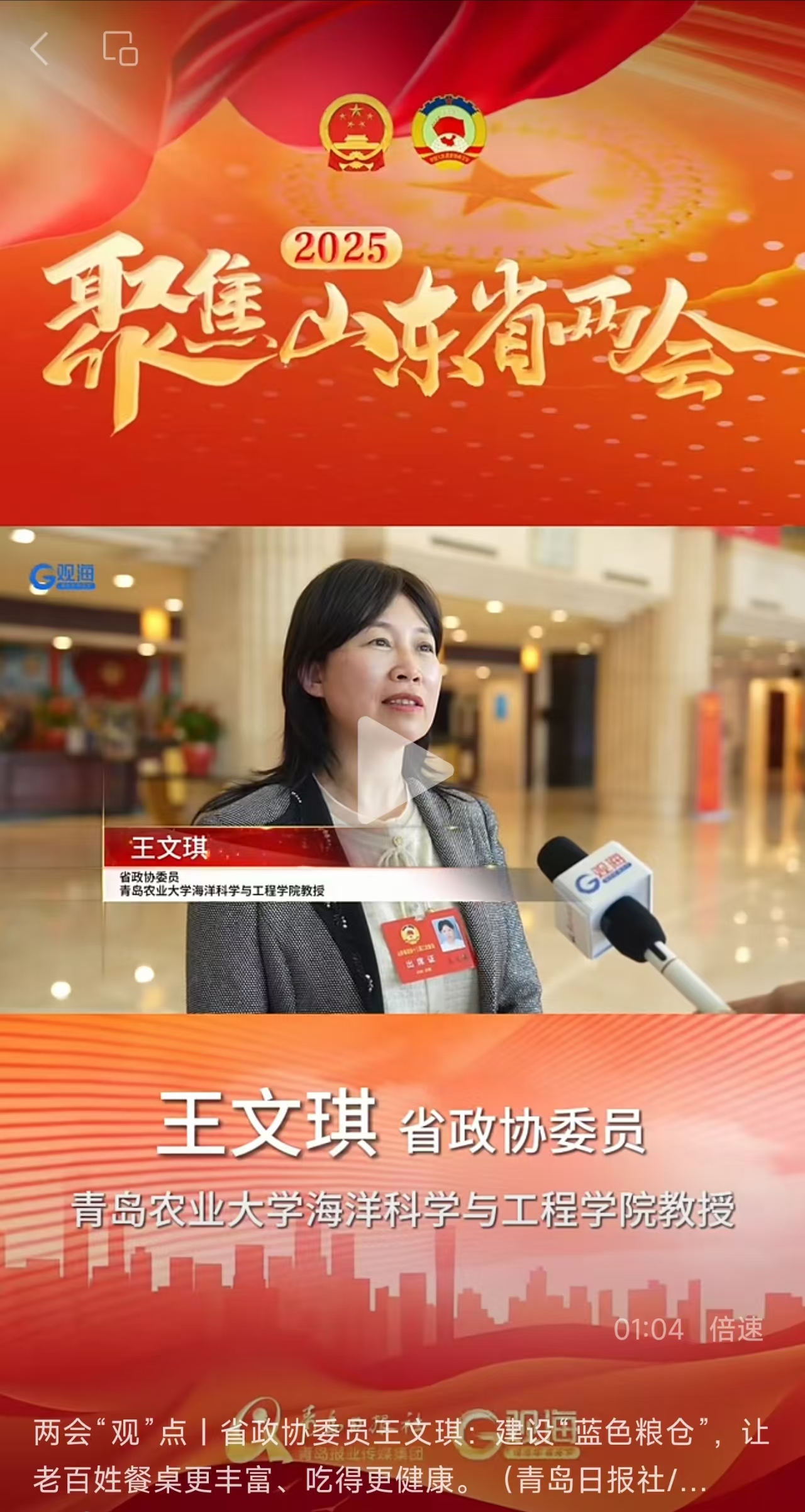 【编者按】1月21日,《青岛日报社/观海新闻》以《两会“观”点|省政协委员王文琪:建设“蓝色粮仓”,让老百姓餐桌更丰富、吃得更健康》报道了米兰milan官方网站海洋科学与工程学院教授王文琪接受记者采访。