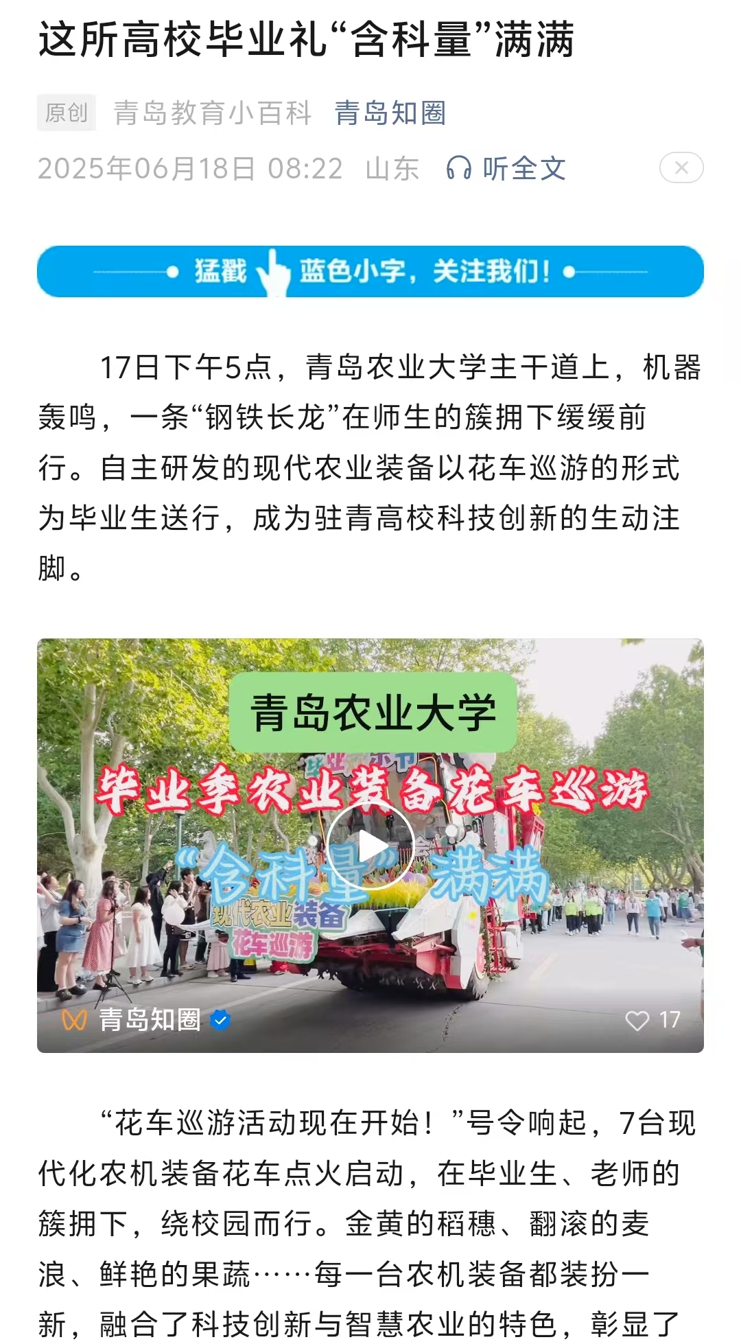 【编者按】6月18日,青岛知圈以《这所高校毕业礼“含科量”满满》为题报道了米兰milan官方网站自主研发的现代农业装备以花车巡游的形式为毕业生送行。
