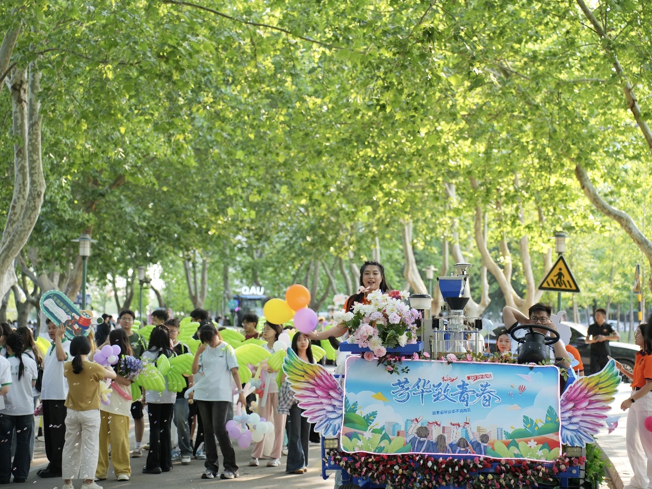 “花车巡游活动现在开始!”号令响起,7台现代化农机装备花车点火启动,在毕业生、老师的簇拥下,绕校园而行。金黄的稻穗、翻滚的麦浪、鲜艳的果蔬……每一台农机装备都装扮一新,融合了科技创新与智慧农业的特色,彰显了青农大在现代农机装备领域的成果,也展现出了青农学子锐意创新、躬耕实践的科研精神。各学院师生头戴创意花环,手持五彩花束组成方阵,与大家热情互动,欢乐留影纪念。