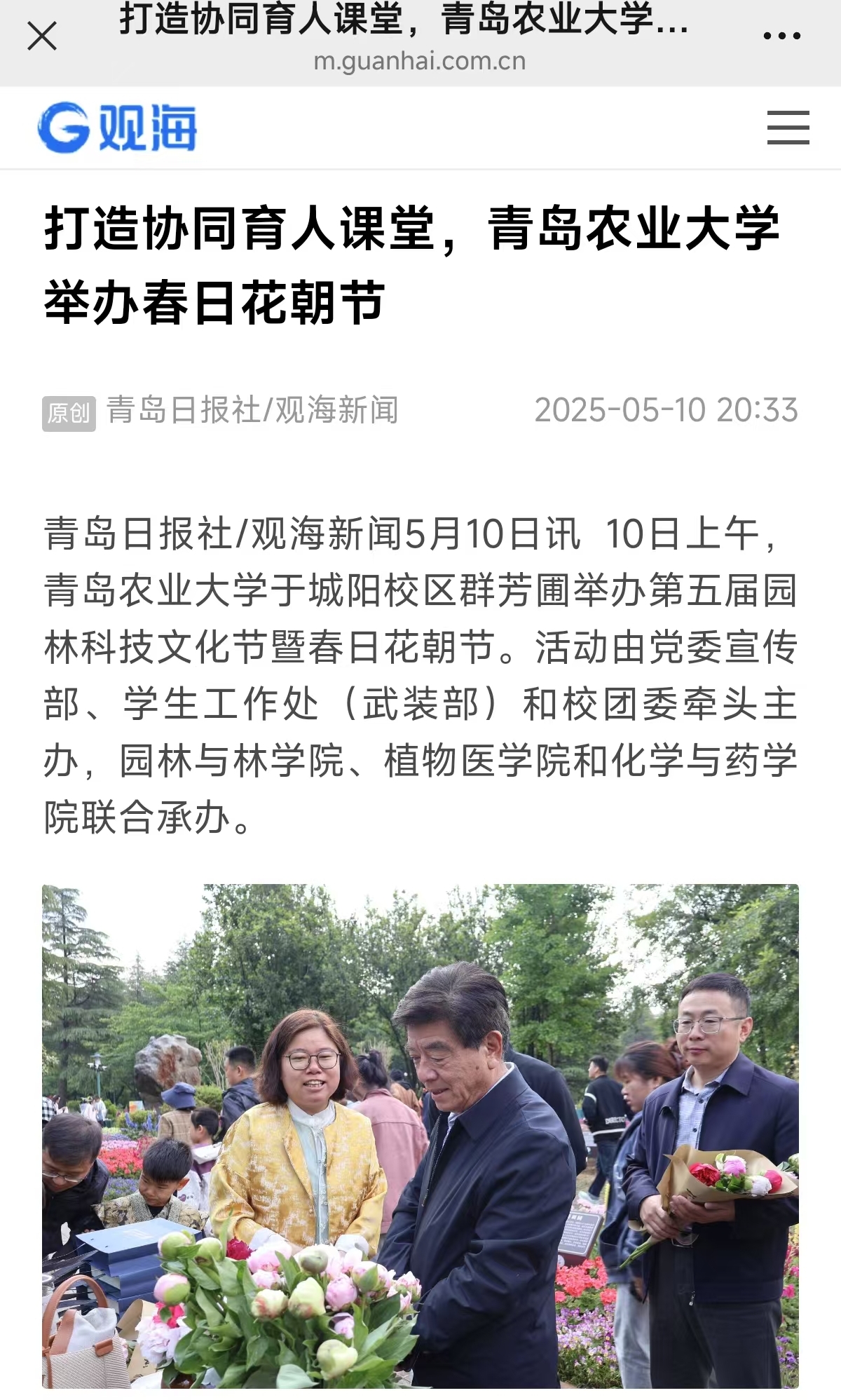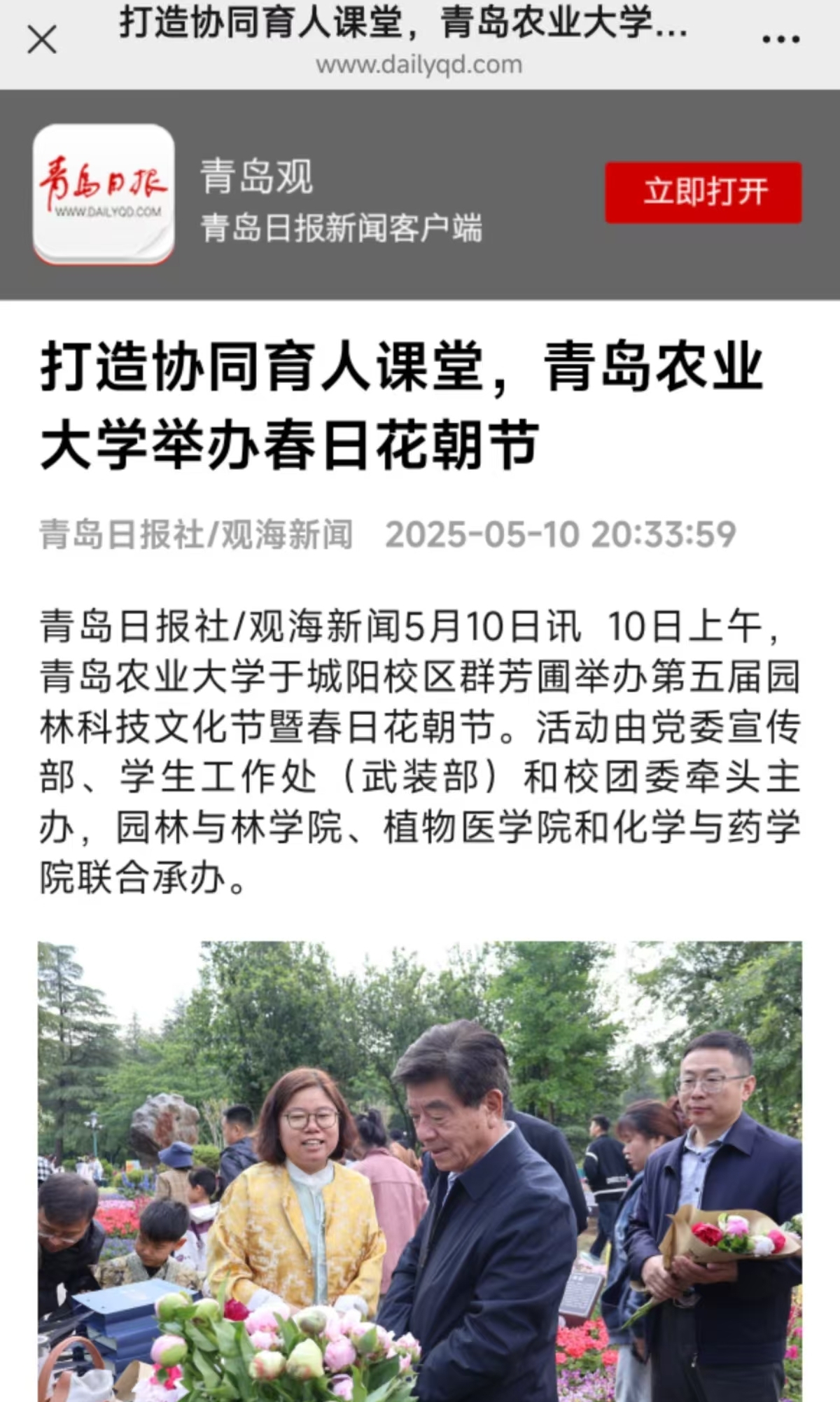 青岛日报社/观海新闻5月10日讯 10日上午,米兰milan官方网站于城阳校区群芳圃举办第五届园林科技文化节暨春日花朝节。活动由党委宣传部、学生工作处(武装部)和校团委牵头主办,园林与林学院、植物医学院和化学与药学院联合承办。