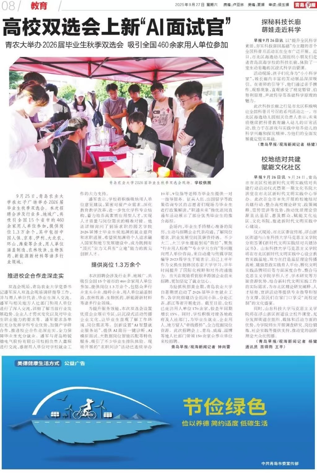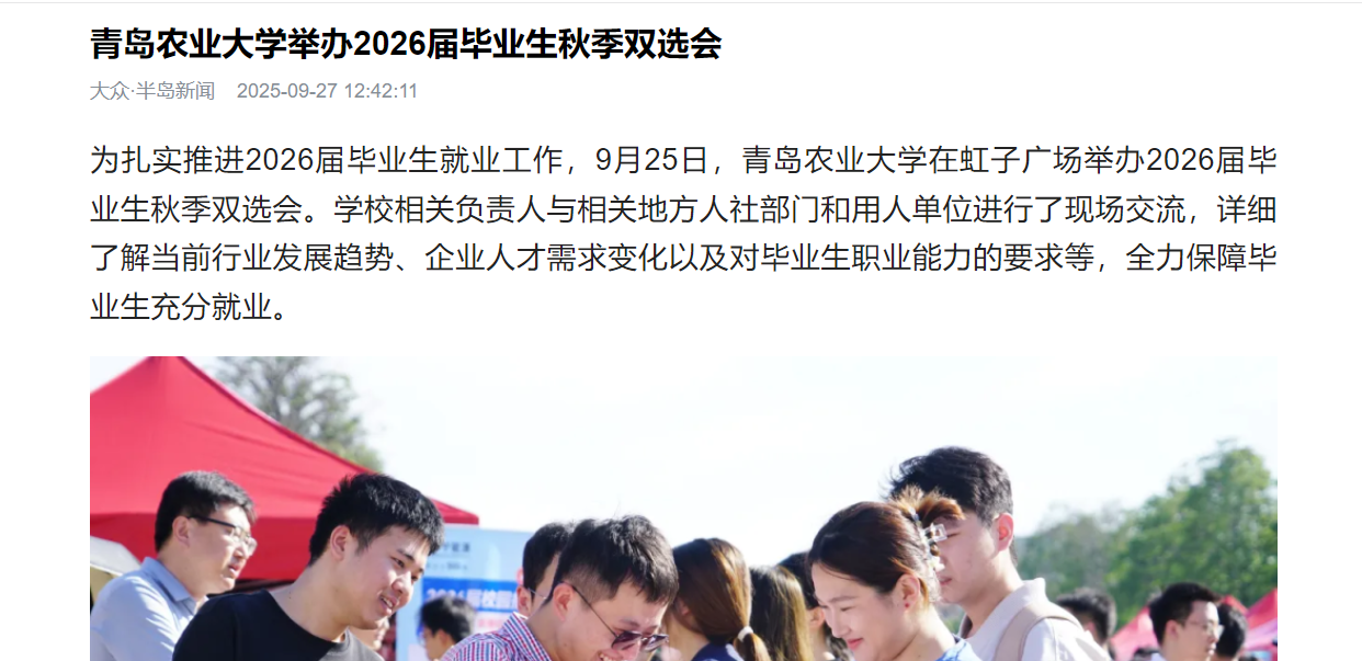 【编者按】9月27日,山东教育卫视、青岛早报、半岛新闻报道了米兰milan官方网站举办2026届毕业生秋季双选会, 吸引全国460余家用人单位参加。