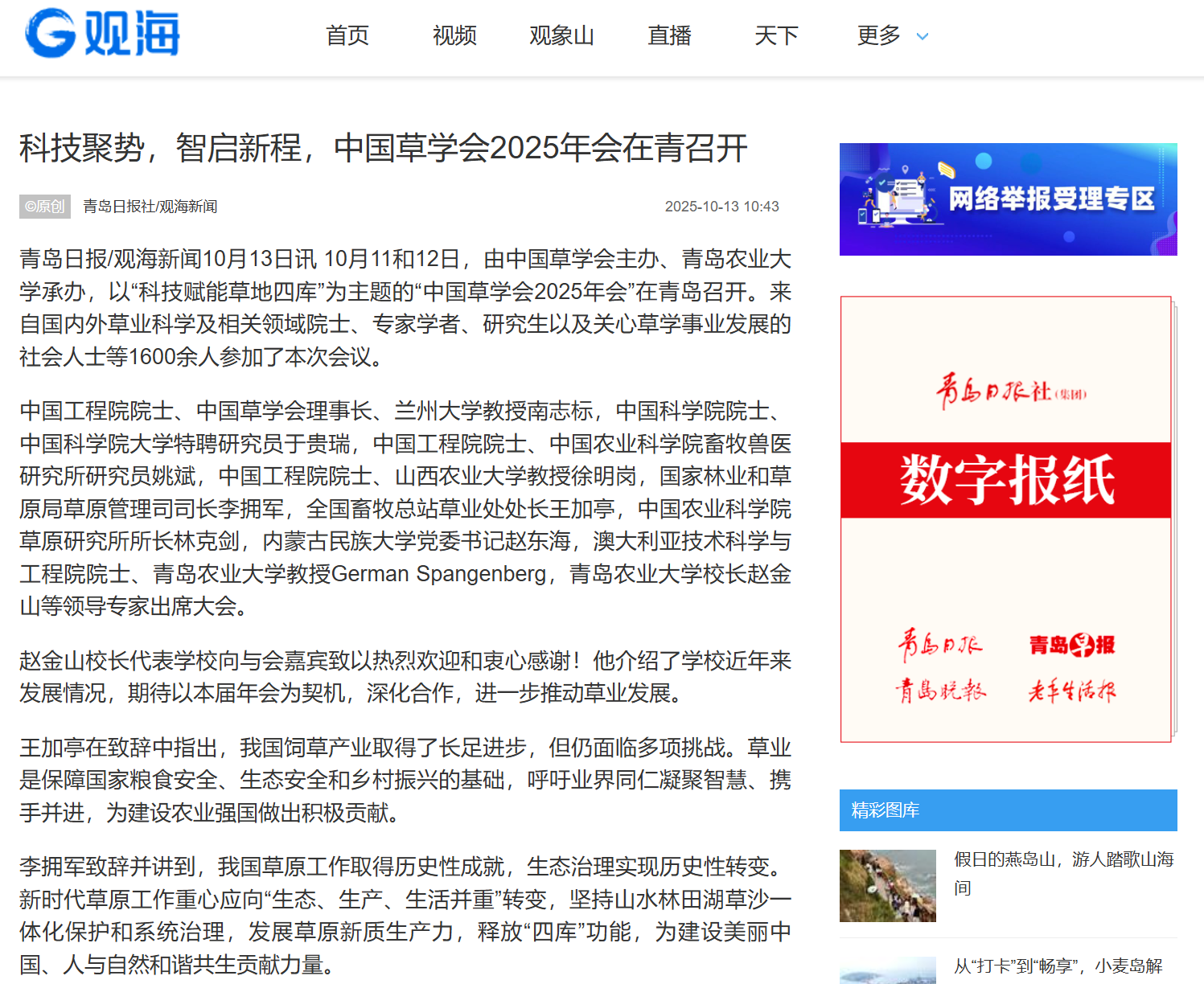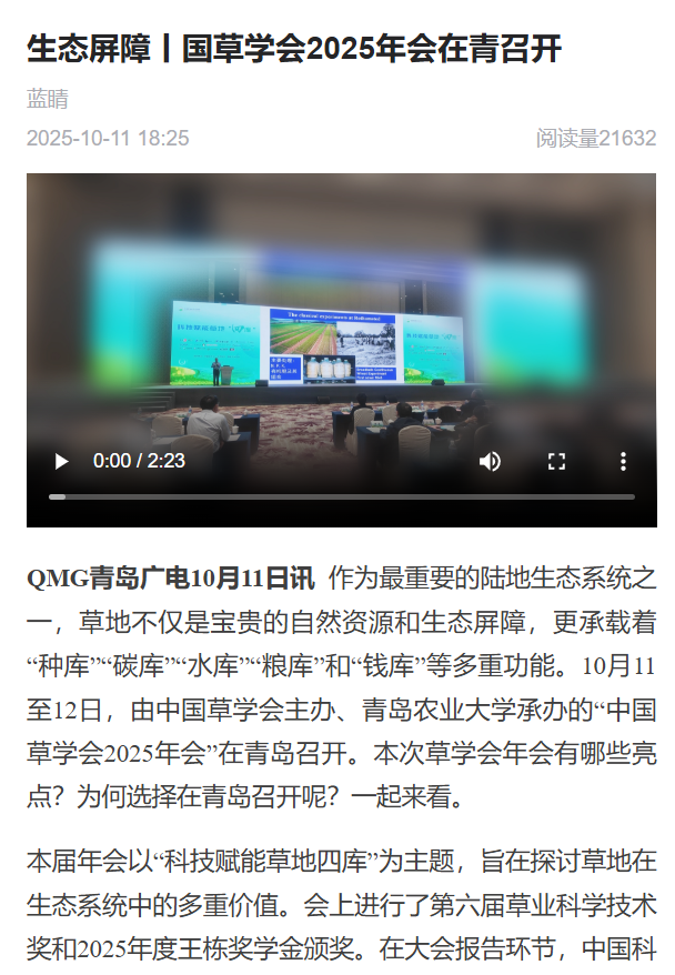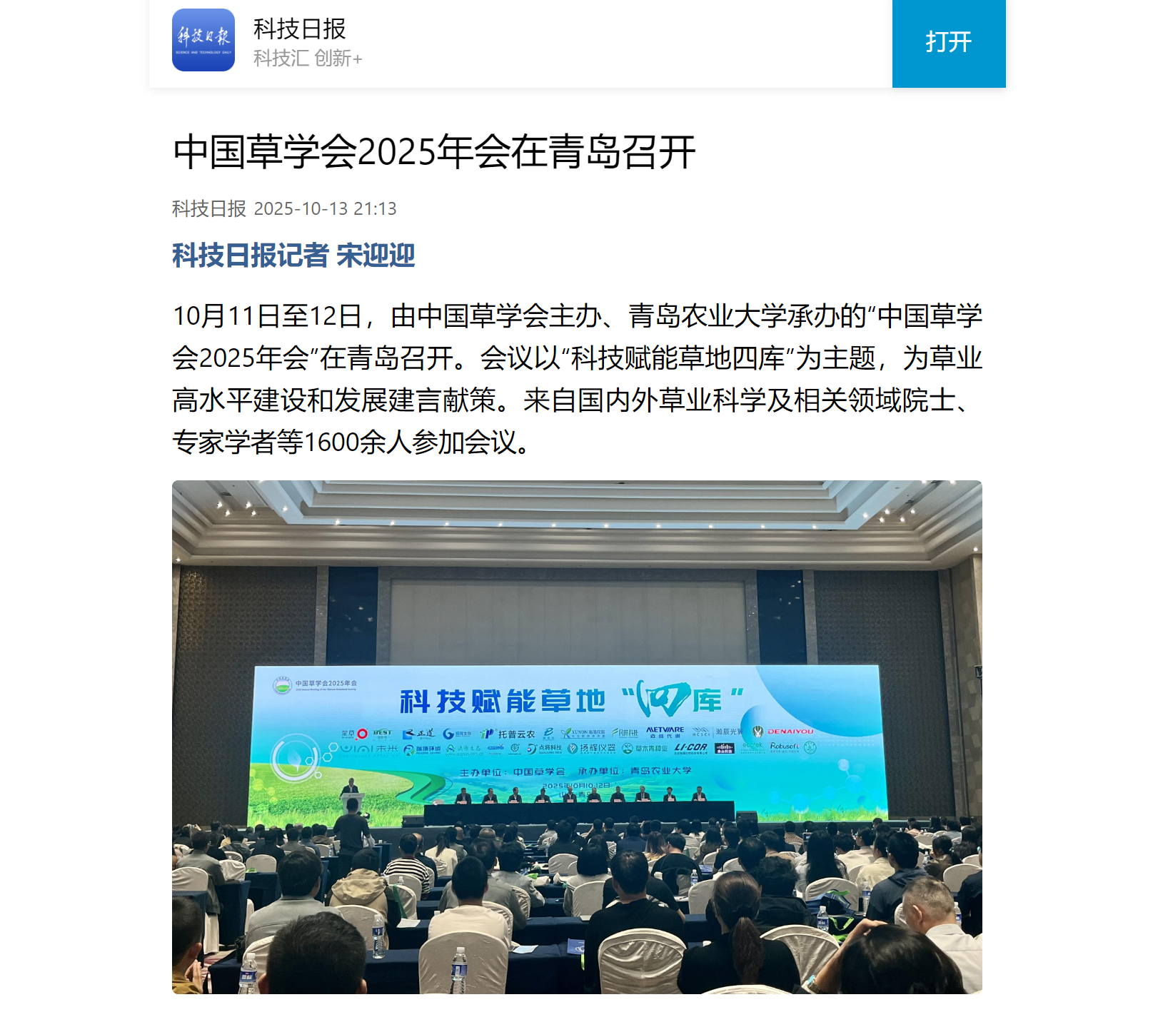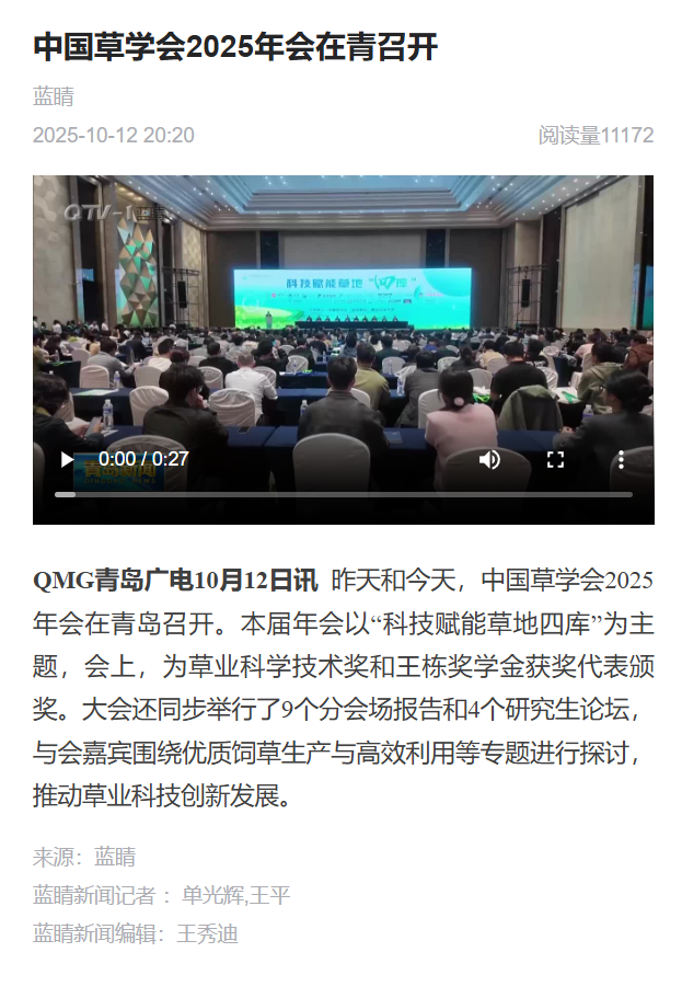 【编者按】10月11日,科技日报、大众新闻、观海新闻、青岛电视台“今日”栏目和“青岛新闻”栏目以《科技聚势,智启新程!中国草学会2025年会在青岛举行》为题报道了米兰milan官方网站承办中国草学会2025年会。
