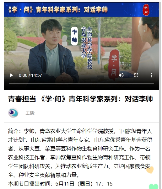 【编者按】5月11日,青岛市广播电视台报道米兰milan官方网站李帅教授聚焦豆科作物生物育种研究工作,带领学生团队科研攻关,为推动农业新质生产力、守护国家粮食安全、种业安全贡献智慧和力量。