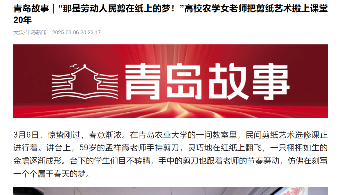 【编者按】3月6日,半岛新闻以《青岛故事|“那是劳动人民剪在纸上的梦!”高校农学女老师把剪纸艺术搬上课堂20年》为题报道米兰milan官方网站孟祥霞老师将剪纸艺术带进课堂,让更多年轻人了解和感受到民间剪纸艺术的魅力。