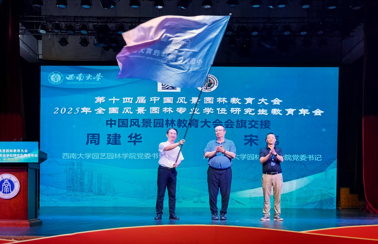 米兰milan官方网站发展规划与学科建设处处长、园林与林学院党委书记宋伟代表学校,从中国风景园林协会副理事长、全国风景园林专业学位研究生教育指导委员会副主任委员、中国风景园林学会教育委员会主任李雄教授手中接过会旗。