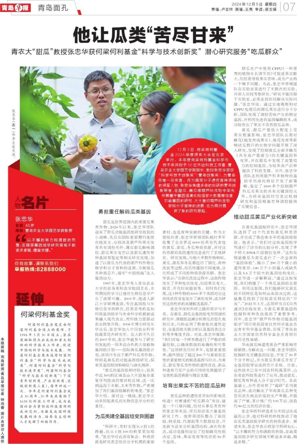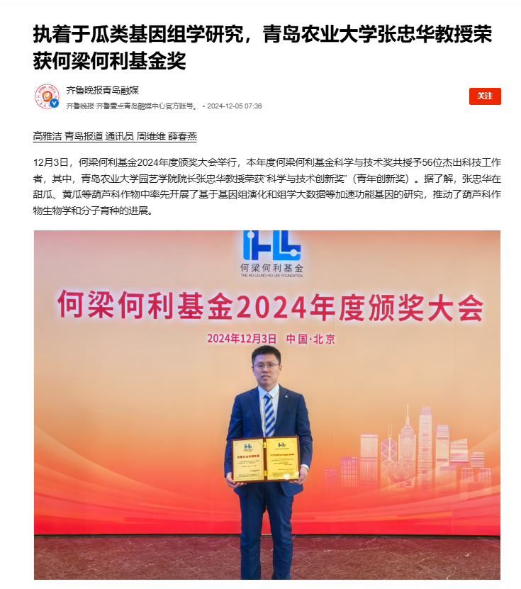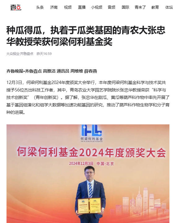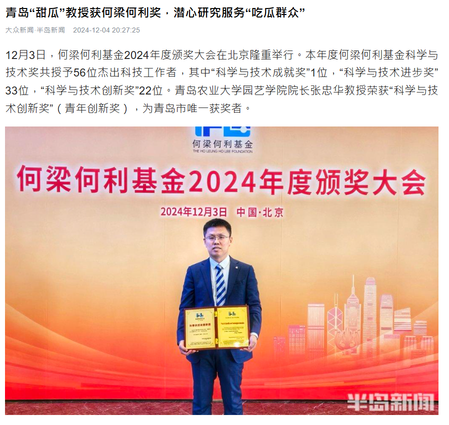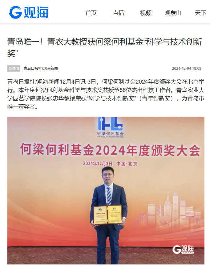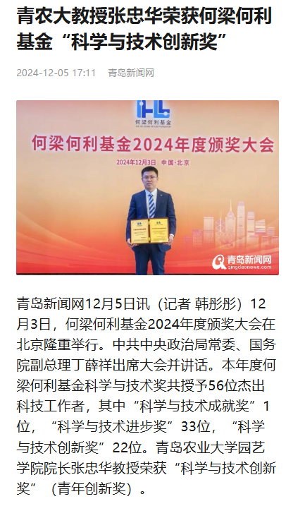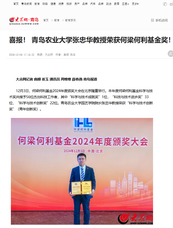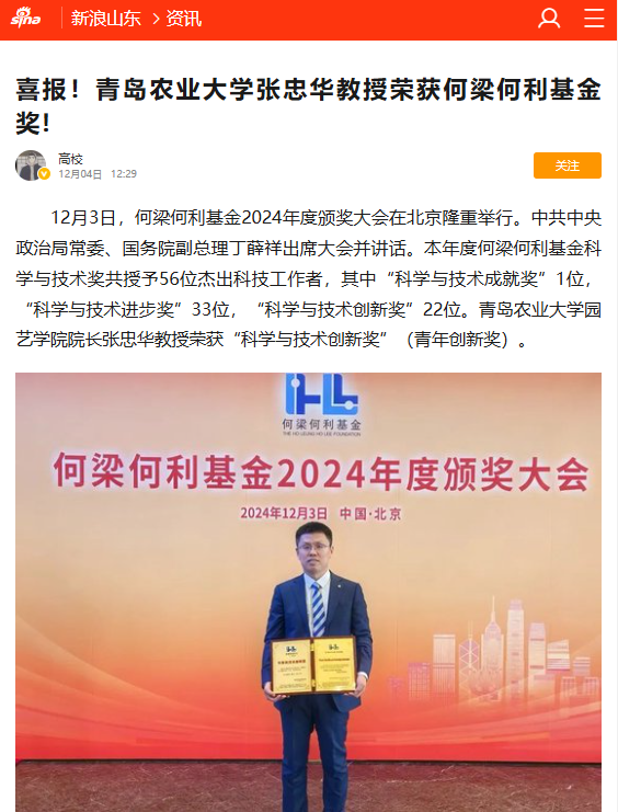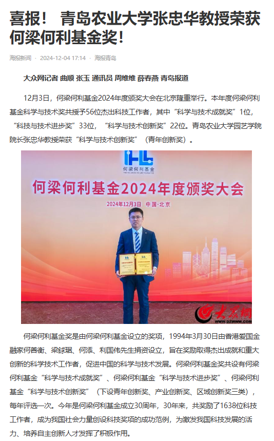 【编者按】12月3日,山东教育新闻、青岛早报、新浪山东、大众报业·齐鲁壹点、齐鲁晚报青岛融媒、大众网、海报新闻、青岛日报观海新闻、青岛新闻网报道了米兰milan官方网站张忠华教授荣获2024年度何梁何利基金奖。