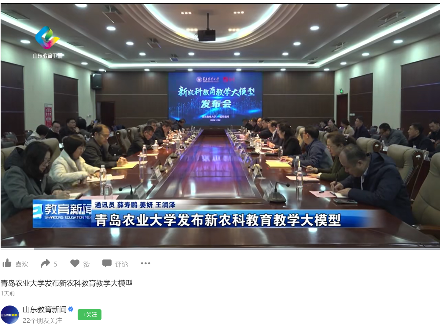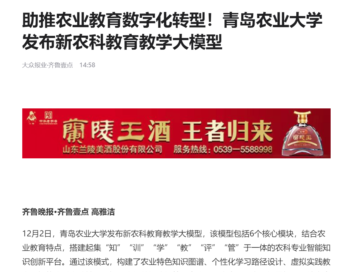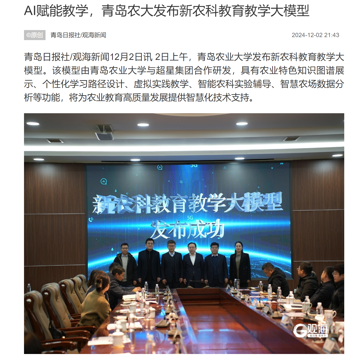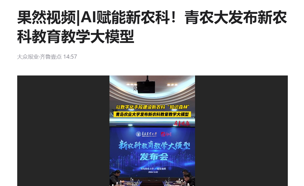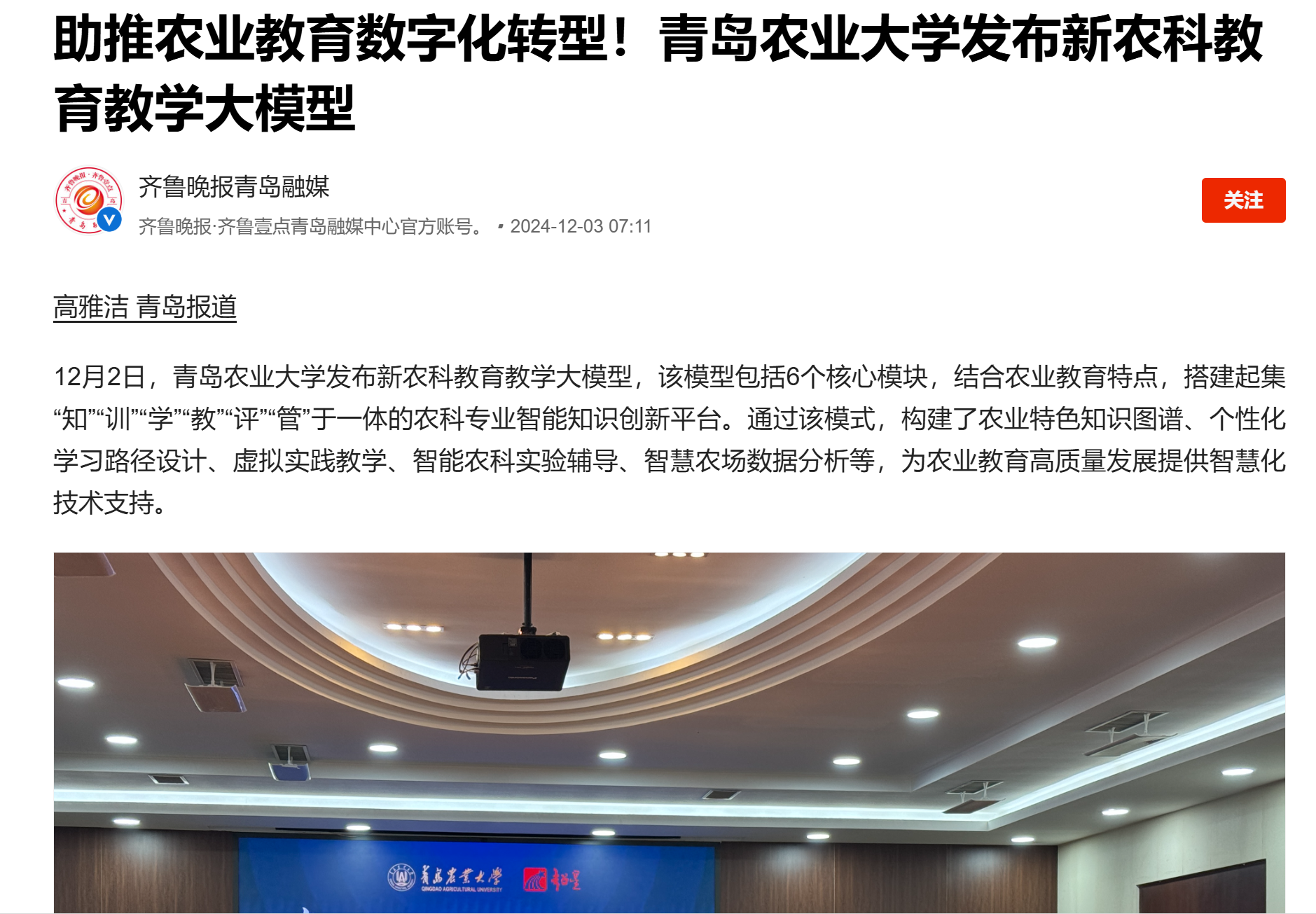 【编者按】12月2日,山东教育新闻联播、山东教育新闻、大众报业·齐鲁壹点、齐鲁晚报、青岛日报社观海新闻、大众·半岛新闻、山东教育新闻联播以《米兰milan官方网站发布新农科教育教学大模型》为题报道了米兰milan官方网站发布新农科教育教学大模型。