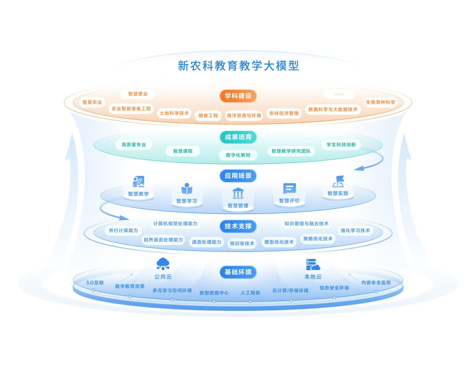 基于大模型建成的农科专业智能知识创新平台,涵盖六大核心模块:AI赋能“知”,即“新农科”自主知识体系,对农科类专业教材、线上课程、实验实践教学案例等资源进行梳理,增加农业数据科学、智能农业系统、无人机操作与应用等“新农科”教材及课程内容;AI赋能“训”,即以农业智慧化实践教学,配备先进物联网与AI算法的实验实训平台、设计数字化实验与实习课程,利用VR和AR技术进行模拟教学,搭建虚拟“智慧农场”“智慧牧场”等综合应用场景,并将智慧农场中的生产数据引入课堂;AI赋能“学”,即个性化学习规划,通过人工智能技术为师生提供个性化教学辅助,推荐定制化学习资源;AI赋能“教”,即教师智能化教学,同时,AI技术还帮助教师开发与现代农业相关的智慧课程;AI赋能“评”,即智能教学评价,实时评估学生学业表现,分析教师教学情况,评估教学质量并提供建议;AI赋能“管”,即智慧化教学管理,AI通过教学数据挖掘支持开课计划、师资分配等管理决策。