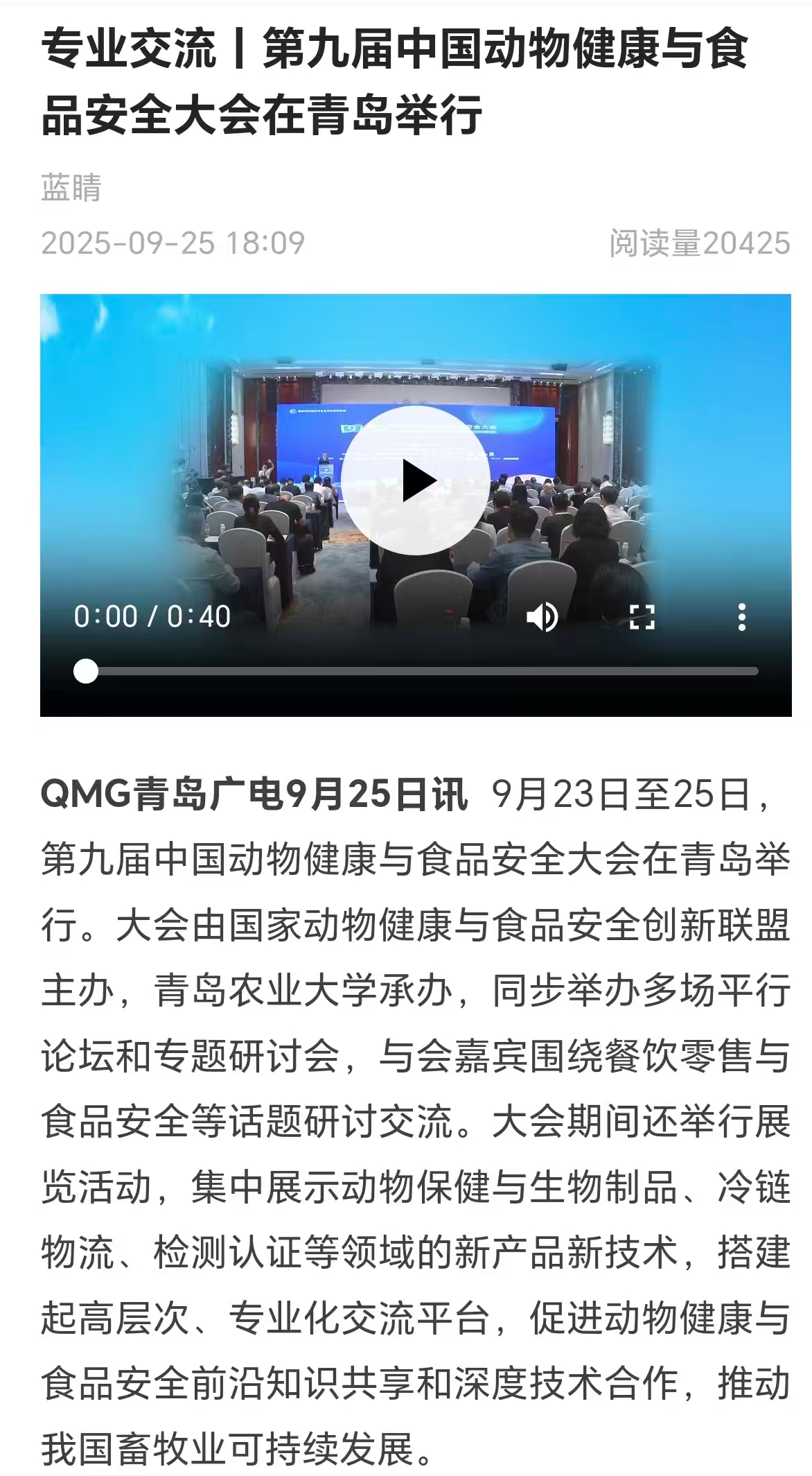 【编者按】9月25日,青岛电视台"今日"栏目报道了米兰milan官方网站承办的第九届中国动物健康与食品安全大会在青岛举行。